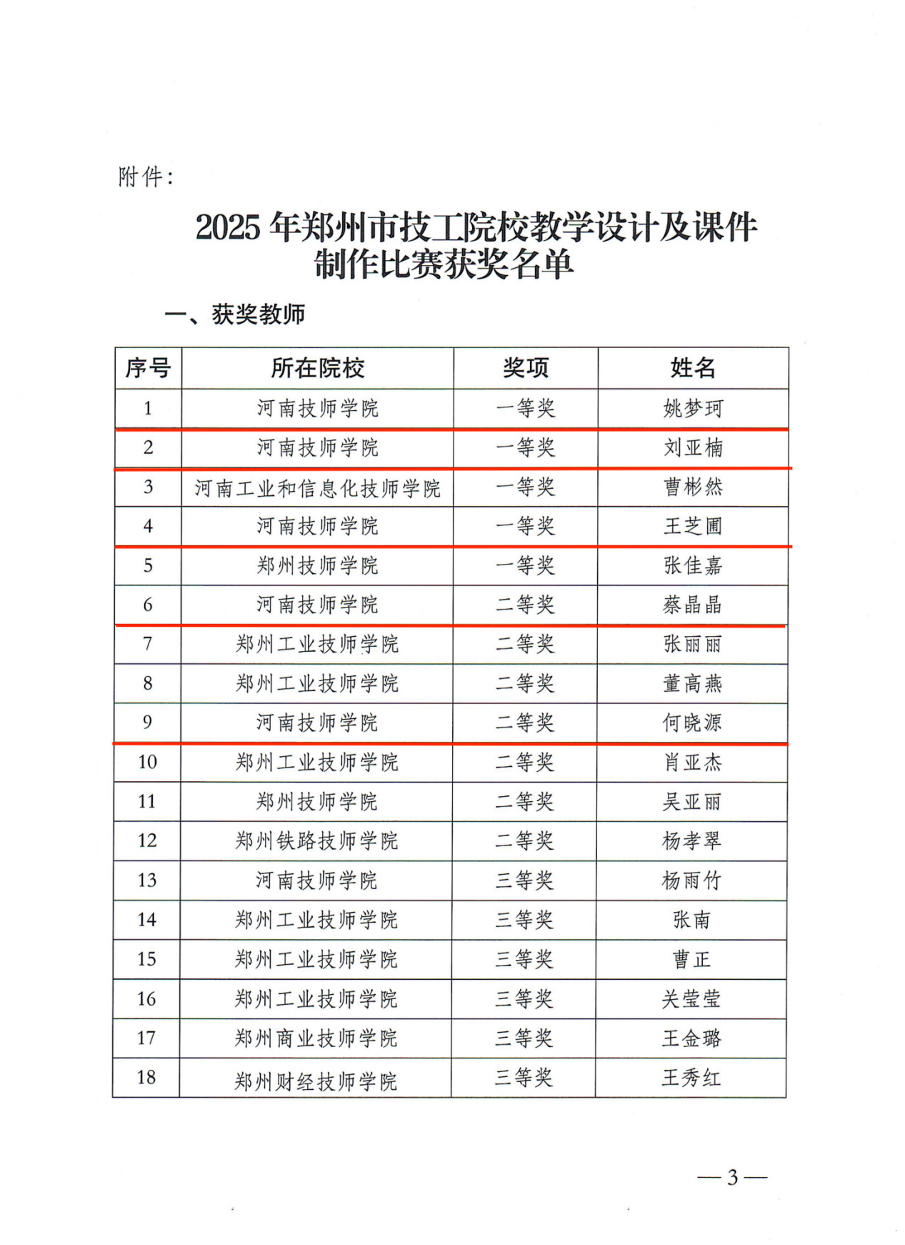 在2025年郑州市教学设计及课件制作比赛中,经各院校选拔推荐,共有32名教师进入市级决赛。其中,我院教师表现突出,姚梦珂、刘亚楠、王芝圃老师获得市一等奖;蔡晶晶、何晓源老师获得市二等奖。