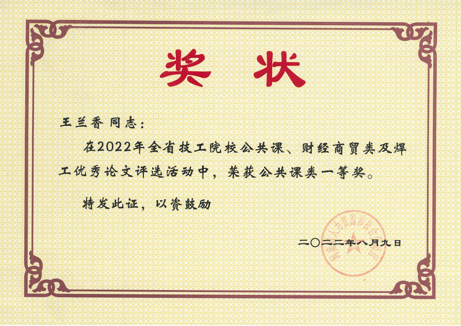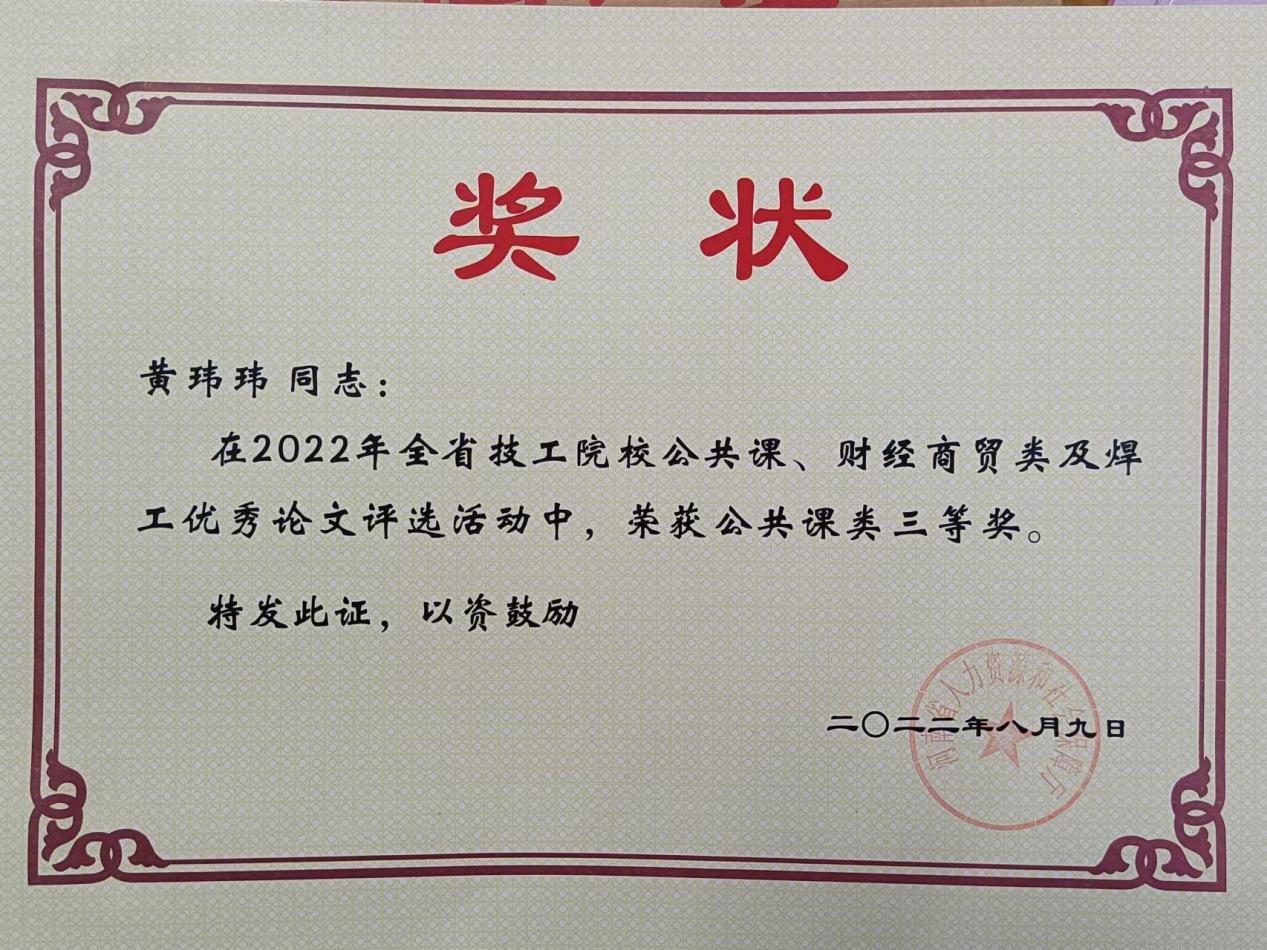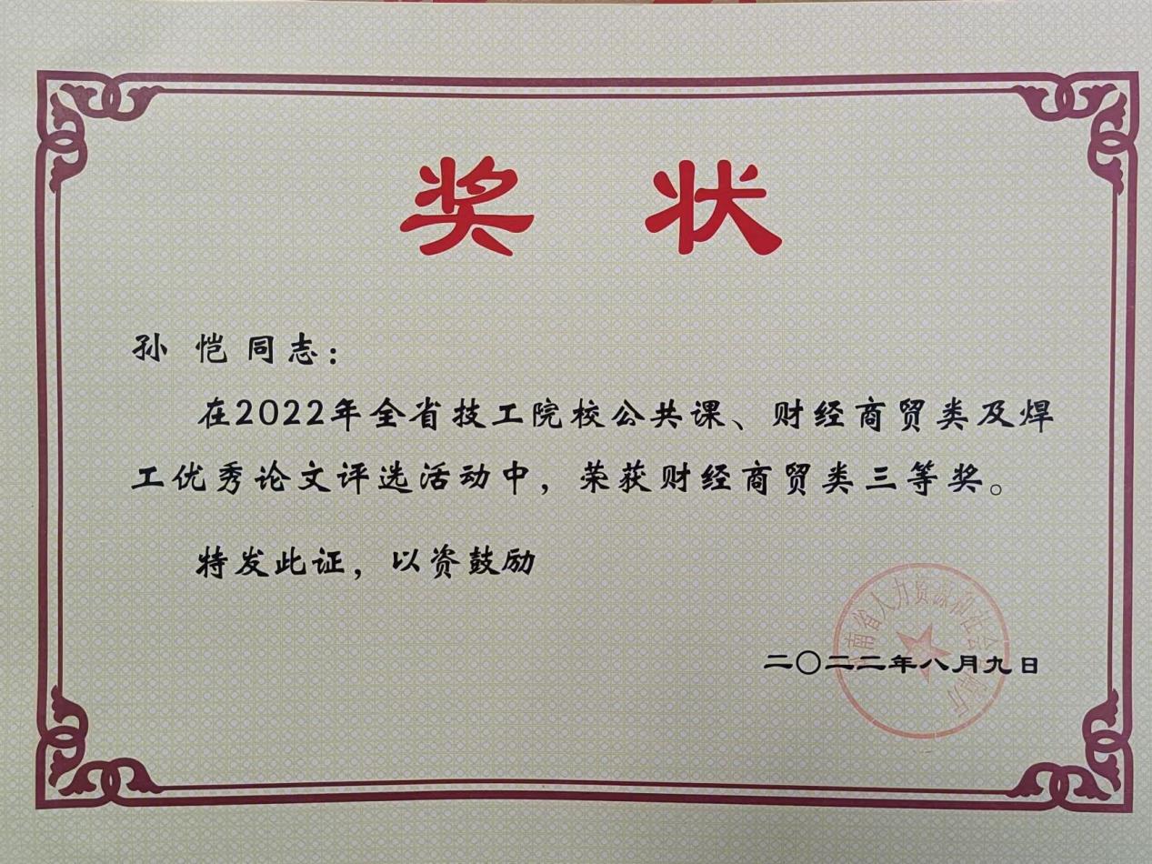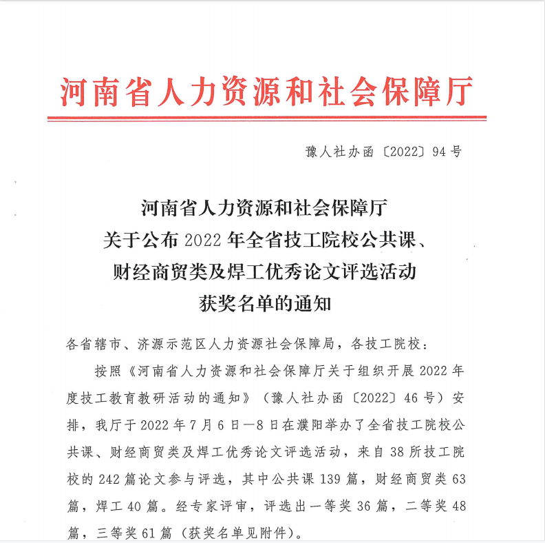近日,河南省人力资源和社会保障厅发布了《关于公布 2022年全省技工院校公共课、财经商贸类及焊工优秀论文评选活动获奖名单的通知》,在此次优秀论文评选活动中,我校参赛教师经过精心的准备,不负众望,荣获佳绩。其中:王兰香老师、黄玮玮老师分别荣获公共课优秀论文一等奖、三等奖,孙恺老师荣获财经商贸类论文三等奖。