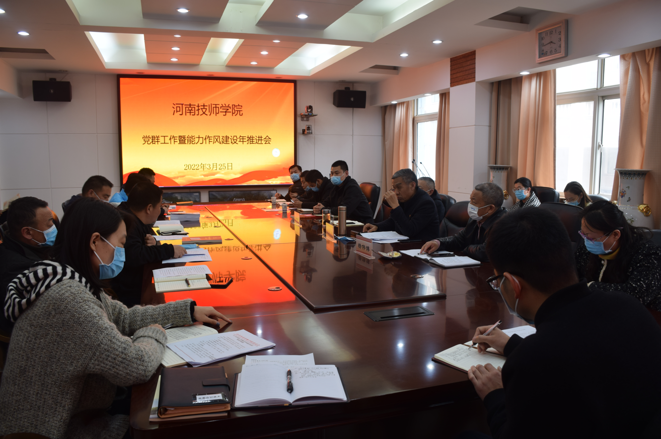 3月25日下午,我校在北校区综合教学楼二楼会议室召开2022年度党群工作暨能力作风建设年推进会。校党委书记谢风来、纪委书记谷天本、副校长杨伟博出席会议,各党支部书记、党群部门和能力作风建设年活动有关责任部门负责人参加会议,会议由谢风来主持。