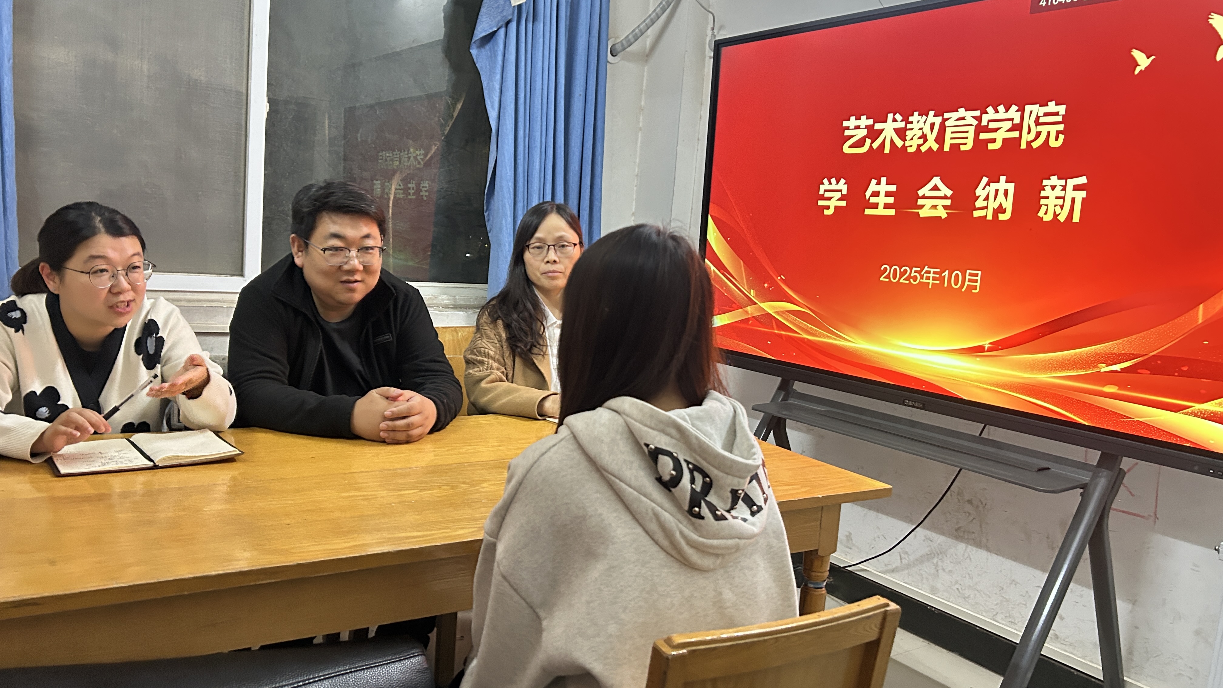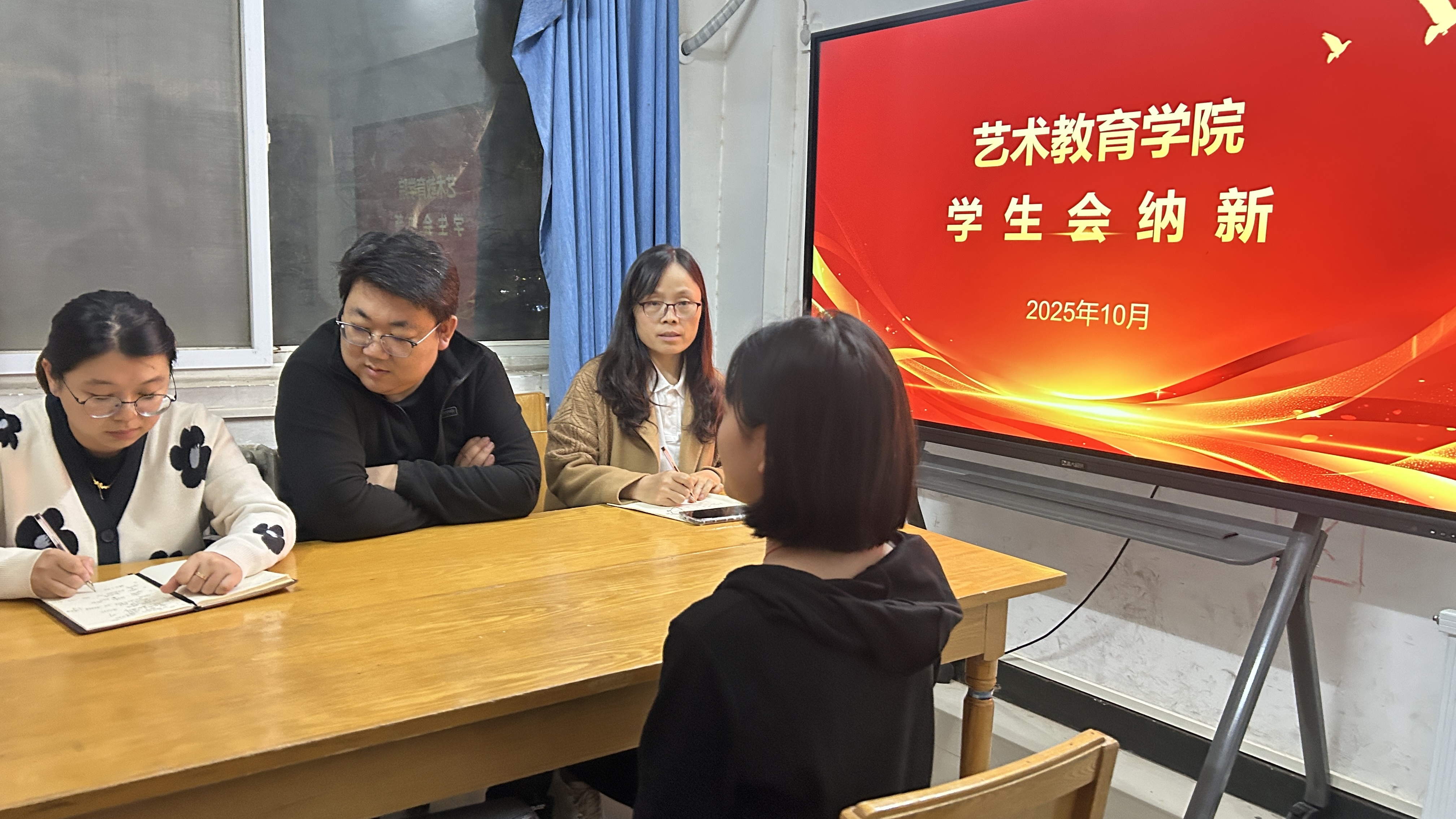10月15日晚,艺术教育学院2025年秋季学生会纳新面试在学院206会议室顺利举行。本次纳新覆盖综合服务部、作风建设部、环境保护部、学习成长部、文体部、宣传部六大部门,共吸引32名新生踊跃报名。院党支部书记狄杰、副书记陈亚昕、团总支书记王晓梅共同担任面试评委,全程参与选拔工作。